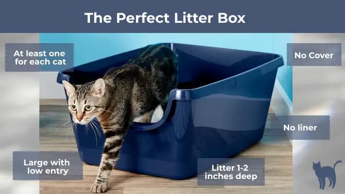 - Make sure your cat has a large enough litter box with easy, low entry.